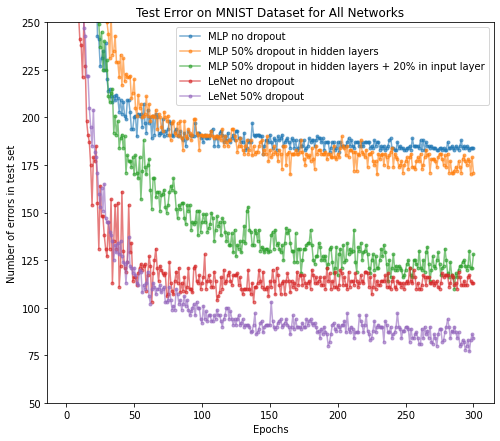 - 보면 알겠지만 LeNet 모델에 50%의 dropout 비율을 적용했을 때가 가장 낮은 test error를 갖는 것을 볼 수 있다.