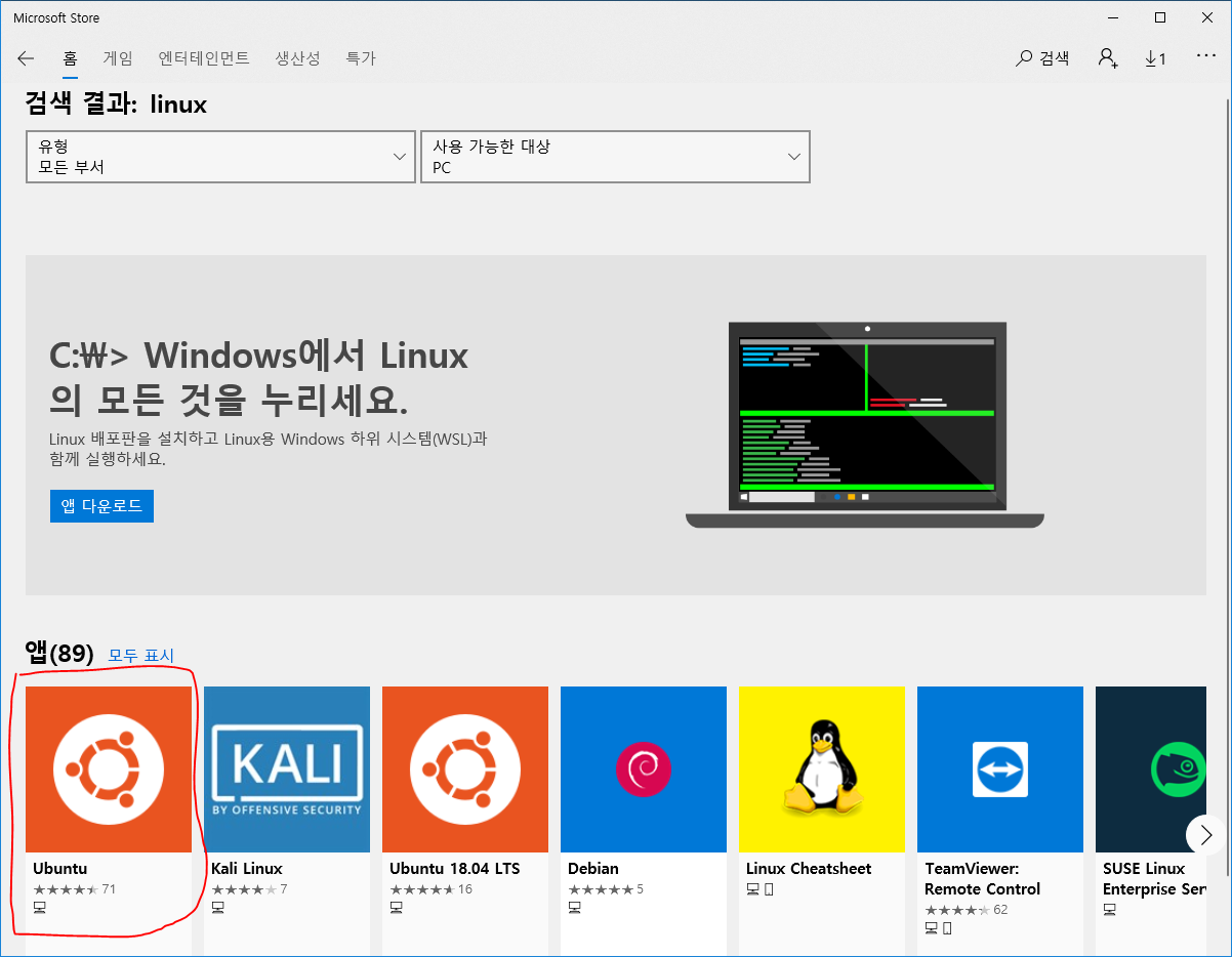 윈도우 검색에서 리눅스를 검색하고, 그림과 같은 Ubuntu를 클릭하여 설치한다.