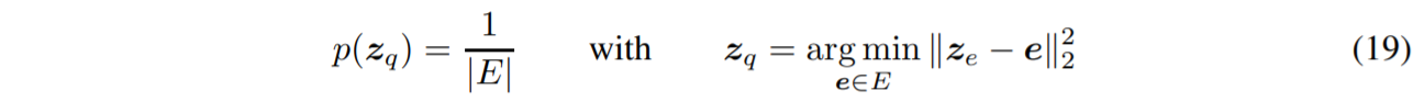중요한 것은 continuous한 $z_e$를 두는 것이 아니라, dictionary $E$에 대한 uniform prior로 부르는 discrete한 $z_q$를 두는 것이다.