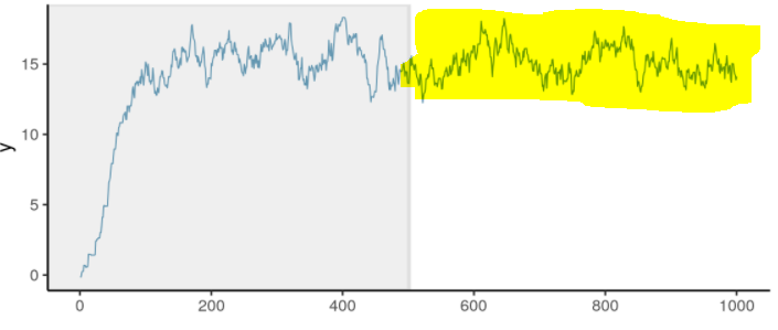 -> 위에서 말했던 처음 generate했던 sample을 버린다는 말은 그림에서 앞에 회색으로 음영된 부분을 버린다는 것을 의미하고, 이렇게 앞의 sample을 버리는 행위를 `burn-in` 이라고 표현한다.