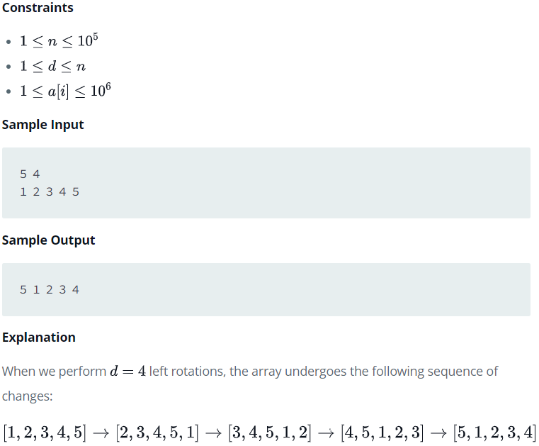 요약하자면, left rotation operation은 n-size의 array를 왼쪽으로 d만큼 돌리는 연산이다.
