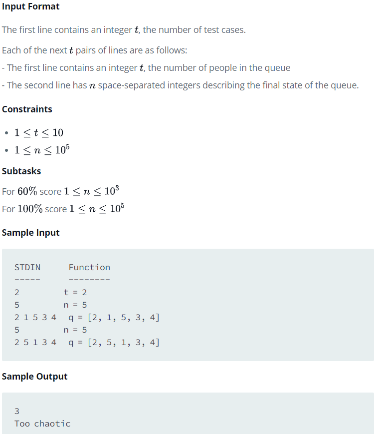 요약하면, [1,2,3, ... , n] 인 list에서 주어지는 list로 변환하려면 몇 번의 swap이 있었는지 반환하거나, 적어도 하나의 원소라도 3번 이상의 swap이 발생하면, "Too Chaostic"을 반환한다.