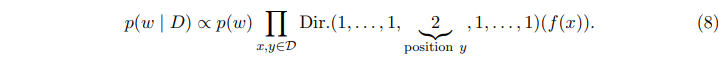 이러한 사실에 근거하여, Dirichlet 분포를 conjugate하는 multi-nomial likelihood를 사용하면 6번 식을 7번 식으로 다시 쓸 수 있다.