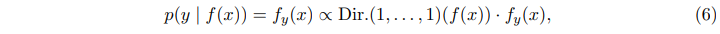 만약 prior $p(w)$를 무시하고 uniform한 $f(x)$를 적용한다면, $(x,y)$에 대한 posterior는 $f(x) = Dir.(1,..,2,...,1)$이 되고, correct class에 대한 posterior mean은 $\frac{2}{C+1}$이 될 것이다.