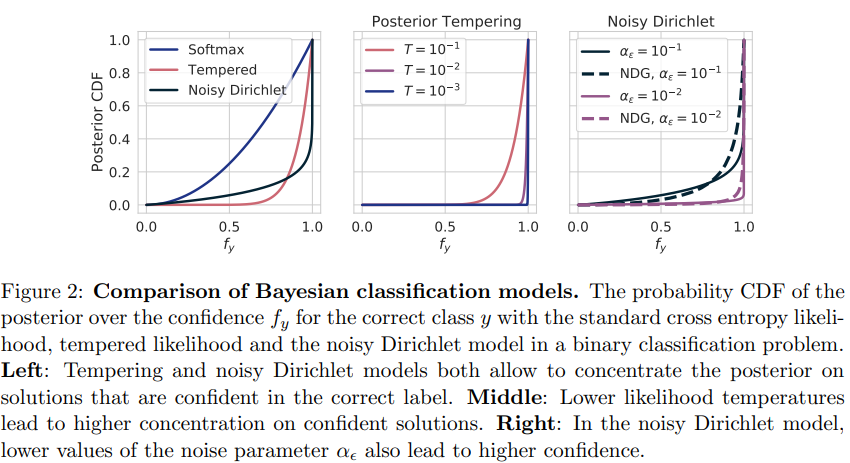 - 왼쪽 그림은 이진분류 문제에서 standard soft max likelihood, temperd likelihood, noisy Dirichlet model를 사용하여 correct class $y$에 대한 confidence $f_y$의 posterior dist. CDF를 나타내고 있다.