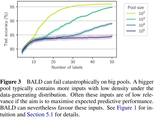 pool size가 커지면 더욱 애매한 input이 pool에 포함될 가능성이 높아지고, BALD는 점점 더 안좋은 예측 정확도를 보인다.