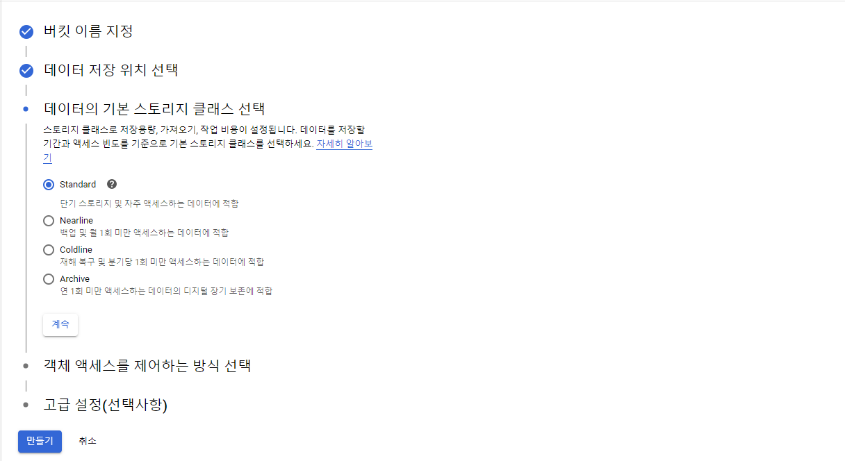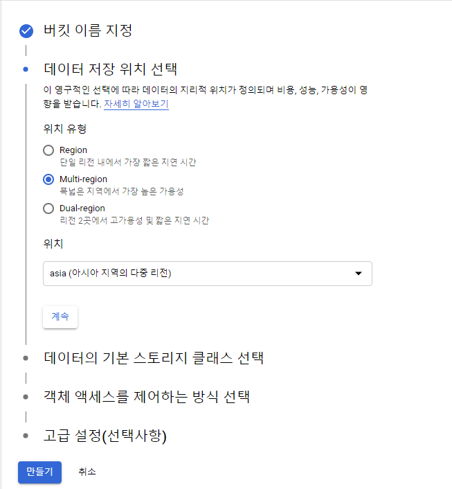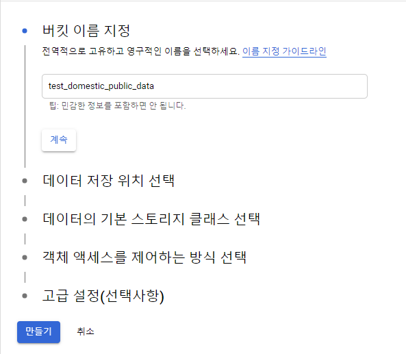 모든 설정이 끝나면 "만들기" 버튼을 눌러 버킷을 생성한다.