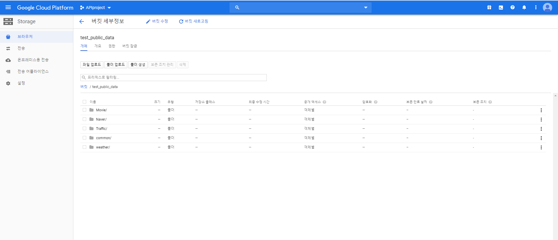 그림과 같이 전체 test_public_data라는 버킷 안에 계층적(hierarchy) 구조를 만들 것이다.