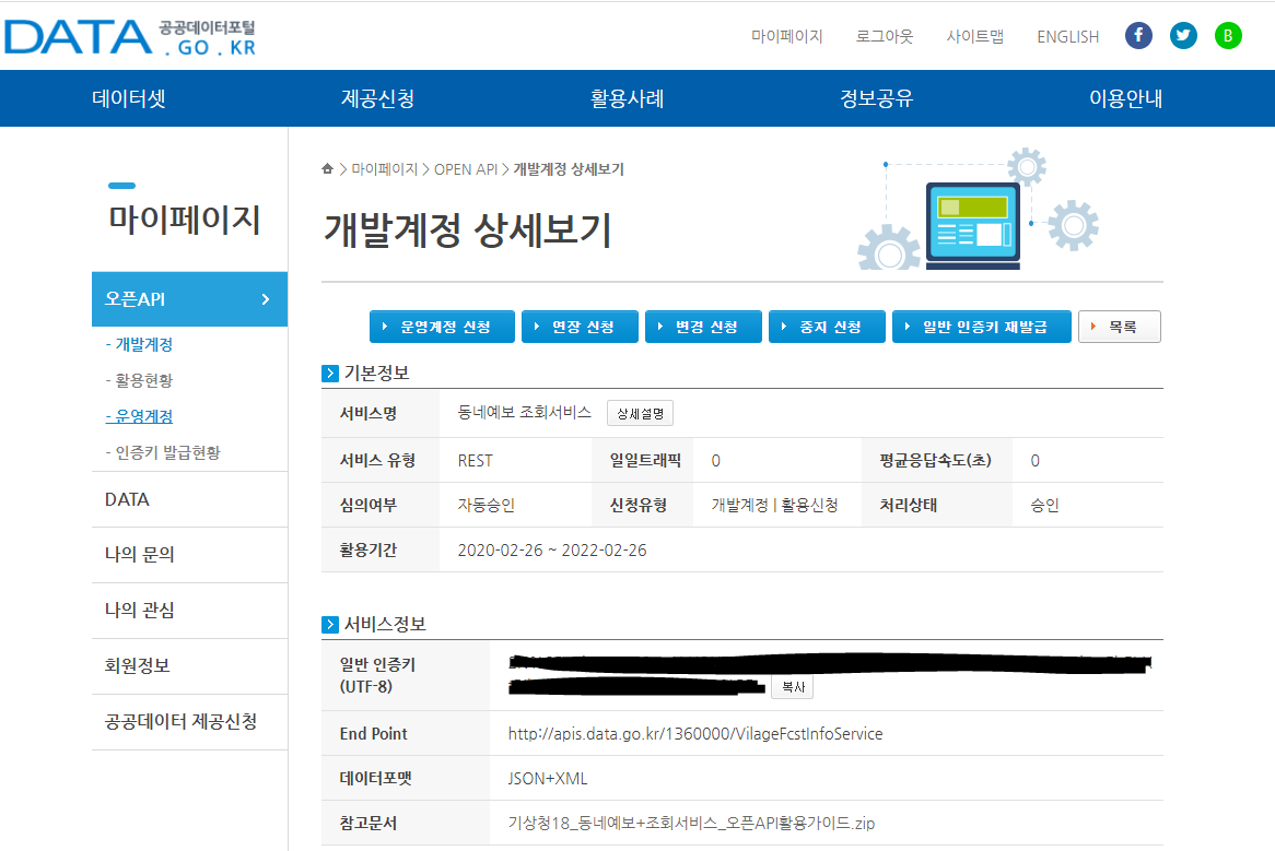 ※ 이때, 참고문서의 "기상청18_동네예보+조회서비스_오픈API활용가이드.zip"을 다운 받는다.