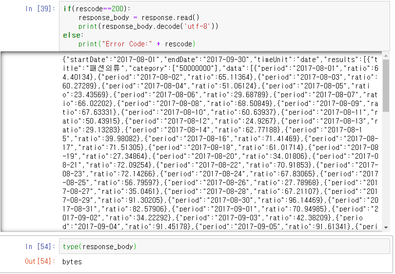 # body = "{\"startDate\":\"2017-08-01\",\"endDate\":\"2017-09-30\",\"timeUnit\":\"date\",\"category\":[{\"name\":\"패션의류\",\"param\":[\"50000000\"]},{\"name\":\"화장품/미용\",\"param\":[\"50000002\"]}],\"device\":\"pc\",\"ages\":[\"20\",\"30\"],\"gender\":\"f\"}";