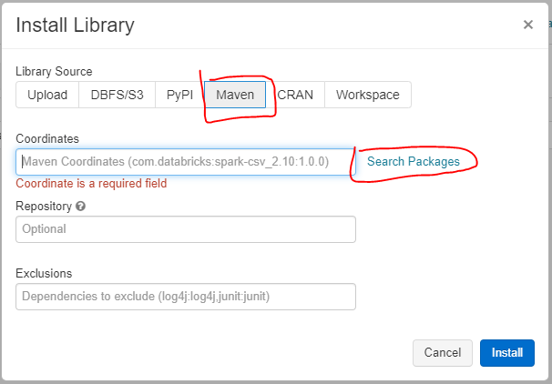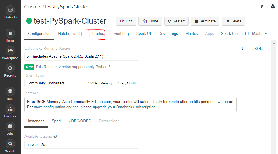 1) 만들었던 클러스터를 클릭하면 다음과 같은 화면을 볼 수 있다. 여기서 위의 Libraries - Install Library 클릭