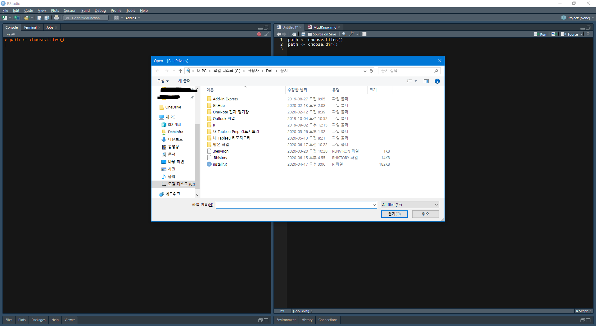 UI적으로 좀 더 편리한 방법이 뭐가 있을까? 바로 choose.files( ) , choose.dir( )를 이용하는 것이다. 우리에게 더 익숙한 UI는 choose.files( ) 함수가 더 좋아보인다.