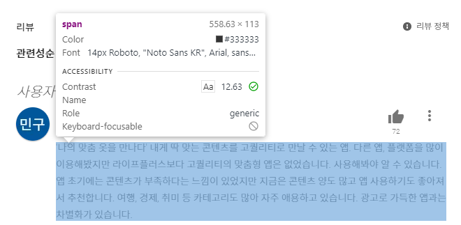 개발자 도구를 이용하여 리뷰 데이터에 접근하기 위한 소스를 확인해보자.