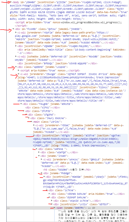 html은 이와 같이 굉장히 많은 하위(트리) 구조를 갖으며 구성이 되어 있다. 여기서 해당 위치를 찾아 반복적으로 데이터를 수집해야한다.
