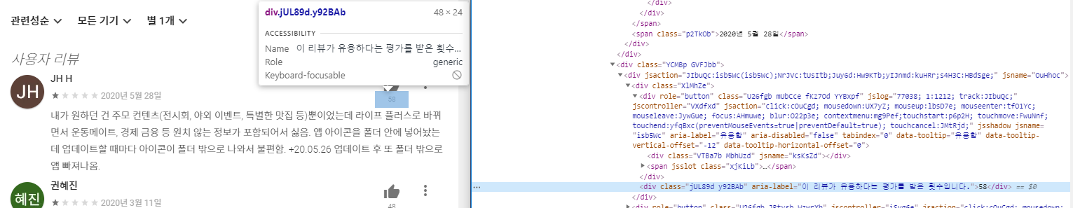 "div" 테그에서 "class", "aria-label" 속성과 "jUL89d y92BAb", "이 리뷰가 유용하다는 평가를 받은 횟수입니다."라는 속성값을 각각 가지고 있다.