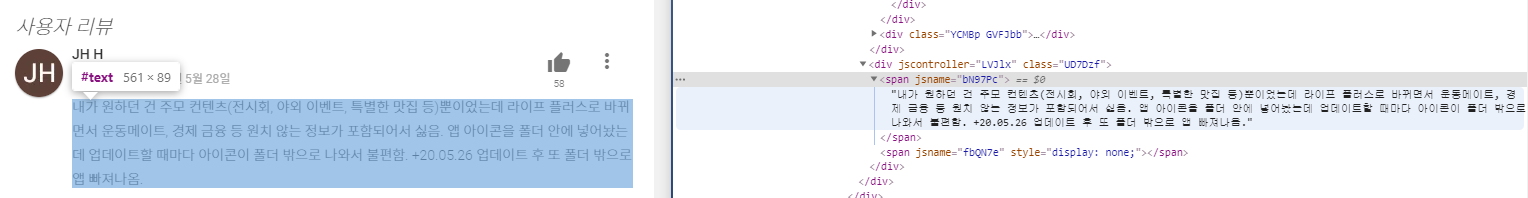 첫번째로 가장 중요한 리뷰 데이터이다. 리뷰가 있는 곳의 html 구조를 살펴보자.