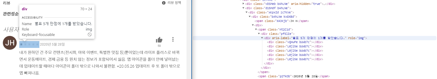 왜냐하면, 그냥 div[@role='img']으로 접근하면 이 어플의 총 별점부터 접근하기 때문에 그 상위(부모) 노드부터 접근해서 내려오는 것이 맞다고 생각했다.