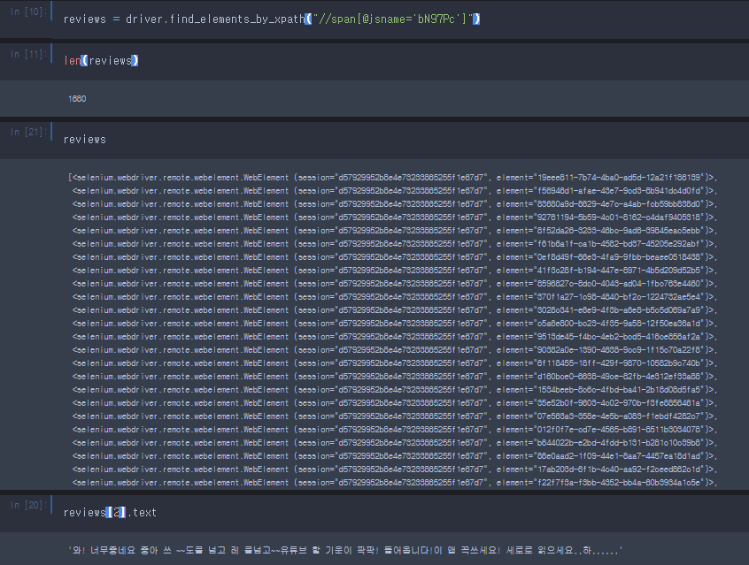위에서 했던것에서 find_element_by_xpath 대신 find_elements_by_xpath를 사용하여 원하는 리뷰 데이터를 한 번에 가져오고자한다.