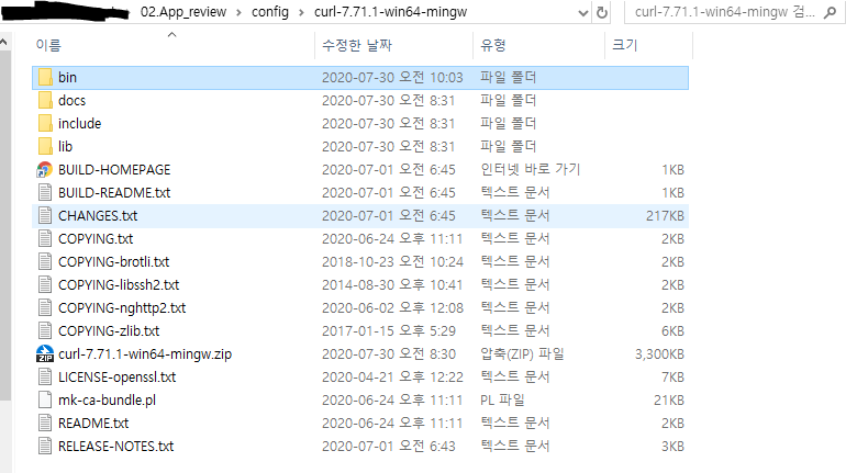 다운로드 후 unzip을 하면 그림과 같은 화면이 나오는데 여기서 bin 폴더의 curl.exe 파일에 집중해보자.