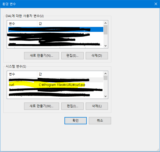 그림과 같이 curl.exe 파일이 존재하는 경로(아까 새로 만들었던 경로)를 "시스템 변수" 쪽에 새로 만들어준다.