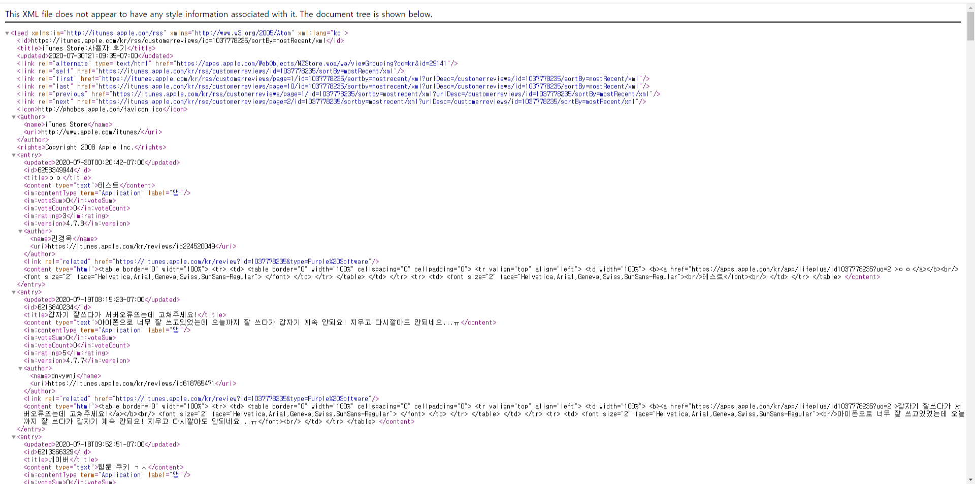 url = "https://itunes.apple.com/kr/rss/customerreviews/page=1/id=1037778235/sortby=mostrecent/xml?urlDesc=/customerreviews/id=1037778235/sortBy=mostRecent/xml"