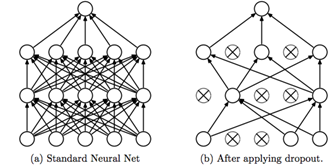 모든 layer의 노드들을 random하게 선택하여 overfit을 방지하는 목적으로하는 regularization 효과를 가져올 수 있다.