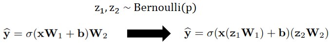 어떤 식으로 적용시킬 것이냐면, 일정 확률(p)로 0과 1을 내뱉는 분포인 베르누이(Bernoulli) 분포를 따르는 확률변수 z1, z2가 있다고 가정하고 이 확률변수들을 각 W1, W2에 곱하게되면, 우리가 알고 있는 dropout을 적용시킨 Neural Network가 된다.