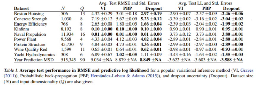 - VI는 Variational Inference, PBP는 Probabilistic Back-Propagation을 의미하고 이들은 BNN의 randomness를 어떻게 줄것인가에 대한 여러 방법론이다.