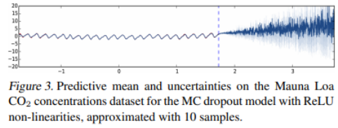 - (c): MC-Dropout과 ReLU activation function을 적용한 결과이다. training data와 멀어질수록 uncertainty도 그와 비례하여 높아지는 것을 확인할 수 있다. 뿐만 아니라, 예측값 또하 어떠한 추세를 가지고 있고, 주기성 또한 갖고 있는 것을 확인할 수 있다. 예측 추세가 다소 좋지는 않으나, uncertainty가 reasonable하다는 것은 누구나 알 수 있을 것이다.