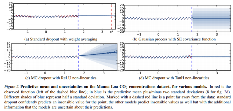 - (a): 일반적인 dropout으로 적용시킨 결과이며, uncertainty를 구한 결과가 아니기 때문에 파란색 음영을 찾아 볼 수 없다. 예측값은 무난하다.